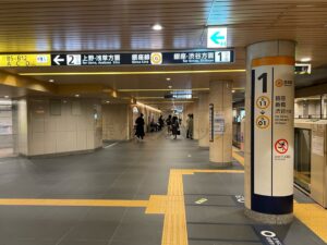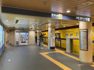 4.改札通過後、東西線ホームを進み、1番最初の階段(2号車3番ドア付近)を上ります。