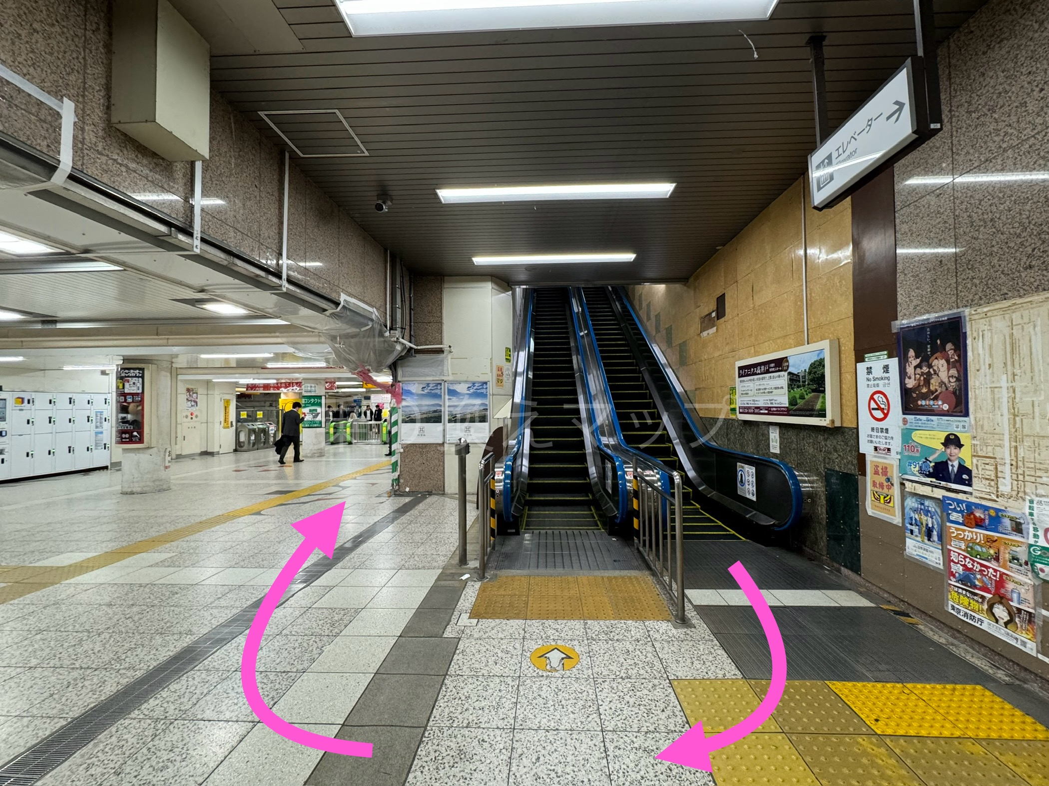 1.4号車4番ドア付近にあるエスカレーターを上ります。