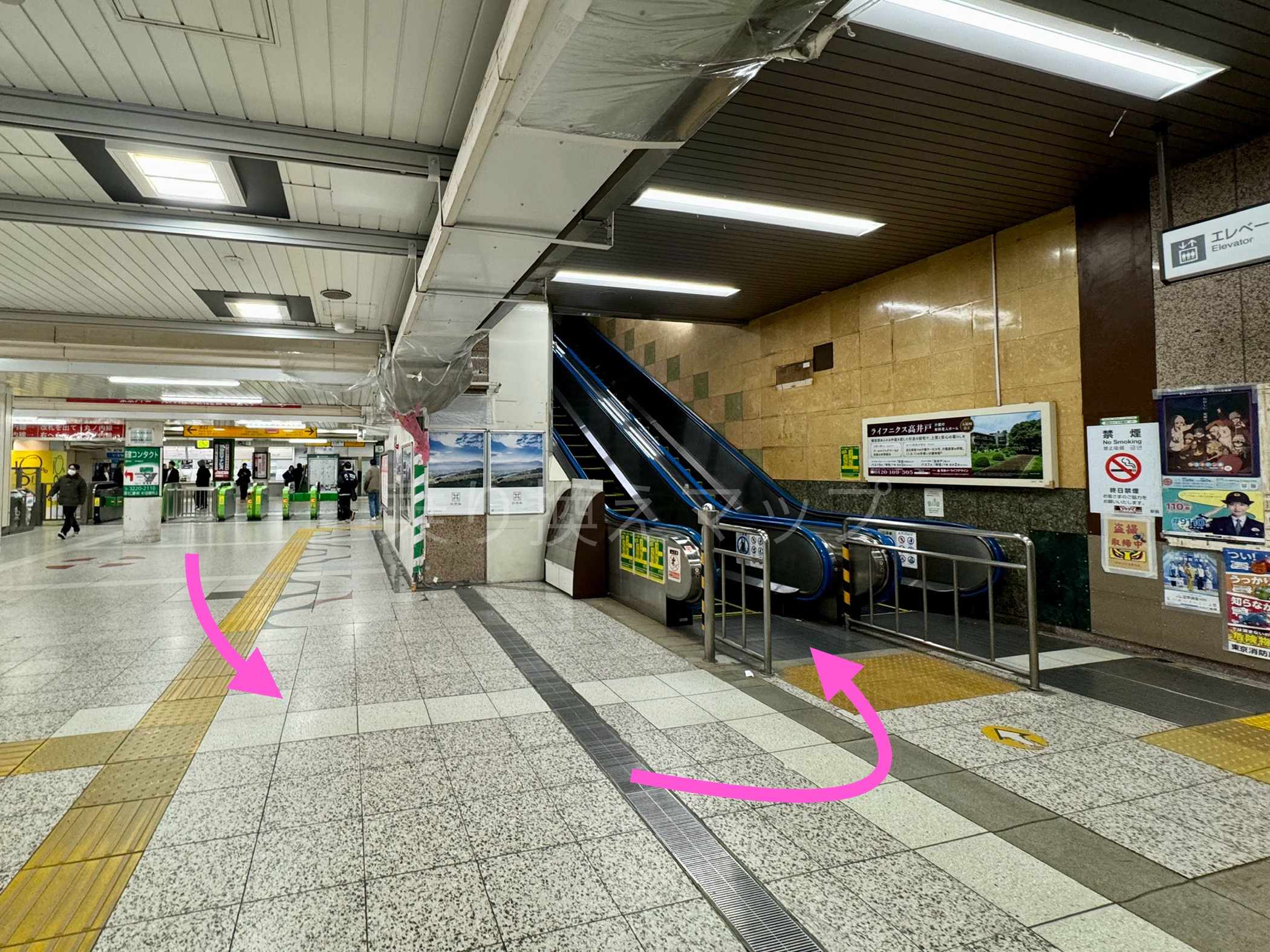 5.斜め左方向へ進み、左後方にあるエスカレーターを上ります。
